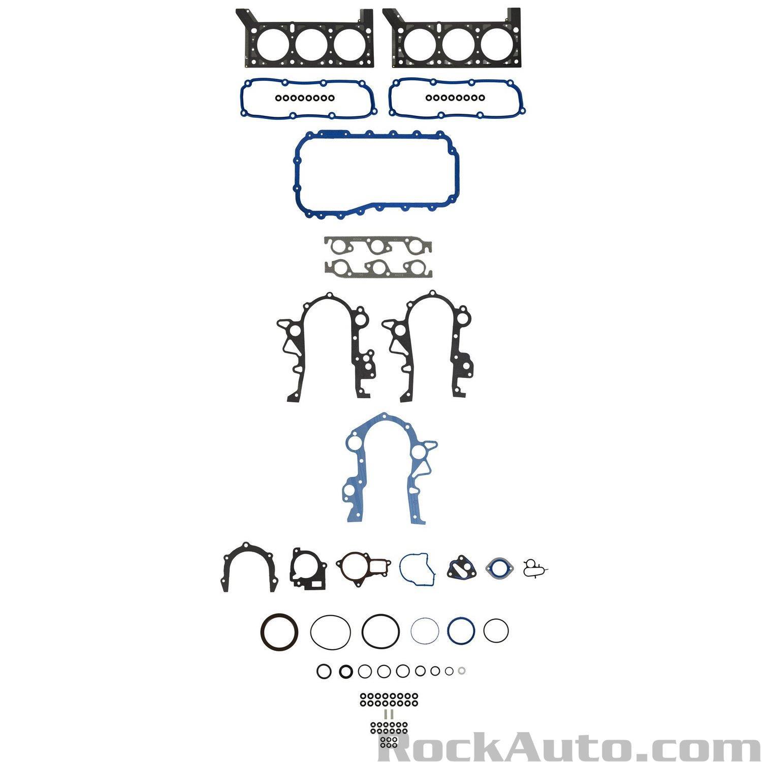 A full gasket set includes all the gaskets and seals needed for a complete engine rebuild, covering both upper and lower engine components.